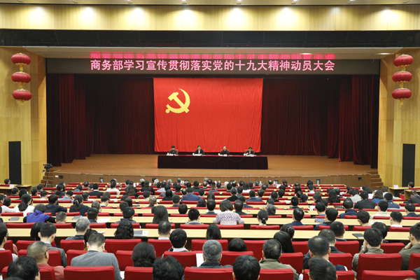 10月27日上午,商务部召开“学习宣传贯彻落实党的十九大精神动员大会”,十九届中央委员、部党组书记、部长钟山同志传达党的十九大、十九届一中全会、十九届中央纪委一次全会精神,就学习宣传贯彻落实工作进行动员部署。部党组成员,部级老干部,部机关全体党员干部,各特派员办事处负责人,离退休干部代表,各直属事业单位、商协学会领导班子成员,约1100人参加。